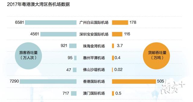 2017年,粤港澳大湾区机场旅客吞吐能力约2亿人次,年货邮吞吐能力约807万吨。客货运规模超过纽约、伦敦、东京等世界级机场群,位居全球湾区机场群之首。