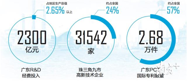 2017年,广东省拥有高新技术企业数量达33073家,其中珠三角地区达31542家。广东R&D经费投入超2300亿元,占地区生产总值的比重将达2.65%以上,R&D人员超过65万人,从事研发的科学家和工程师达45万人,每年来粤工作的境外专家超过13万人次,数量均居全国首位。