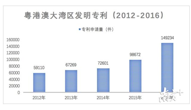 2012-2016年,粤港澳大湾区发明专利申请量实现了翻一番的快速增长。2018年广东省PCT专利申请量达到2.53万件,连续17年领跑全国。