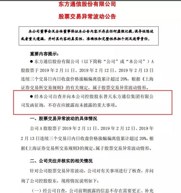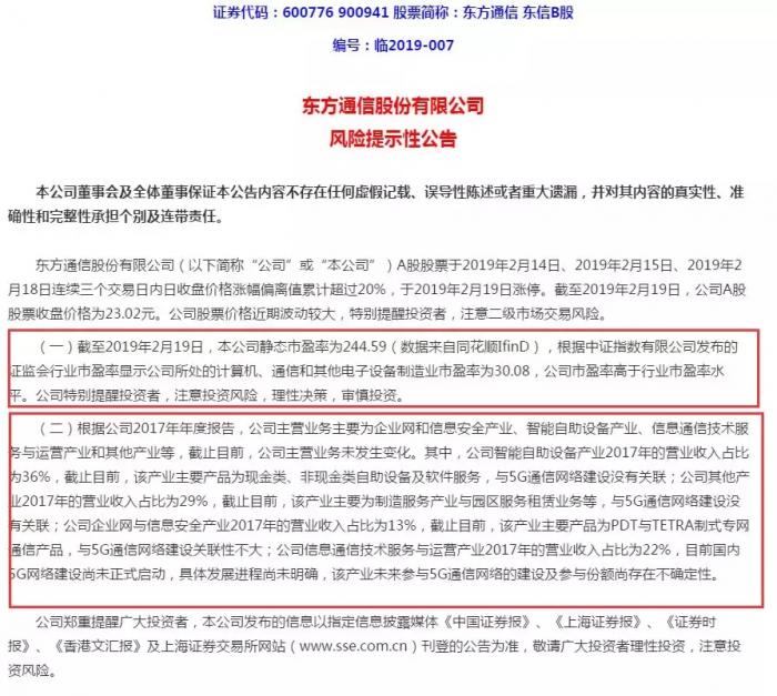 2月19日即昨日收盘后,七天六板的东方通信发布风险提示性公告。