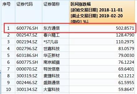扩大范围至A股市场来看,东方通信自去年11月以来累计涨幅502.86%,是唯一一只涨幅在5倍以上的股票,位列第二的贝通信涨幅为244.92%。