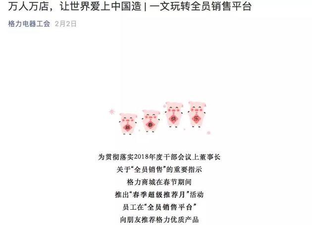 2月7日,格力电器工会连同格力电商管理部共同发起“万人万店格力电火锅专项销售活动”,随后每日经济新闻(微信号:nbdnews)记者也在朋友圈发现,有格力电器的员工参与了电火锅的“全员销售”活动。