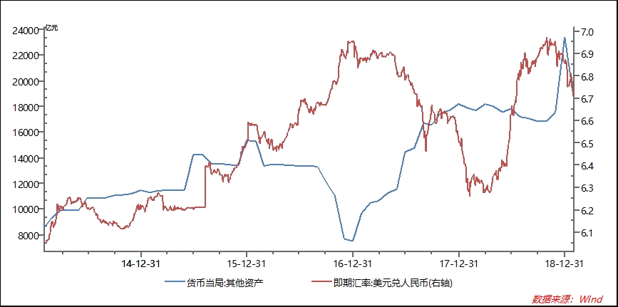 12月其他资产科目由11月份的17530.63亿元暴增至23405.85亿元,央行解释主要是无规律的杂项,但市场猜测可能是央行购买了汇率相关资产做多人民币,并与12月人民币的升值相联系。