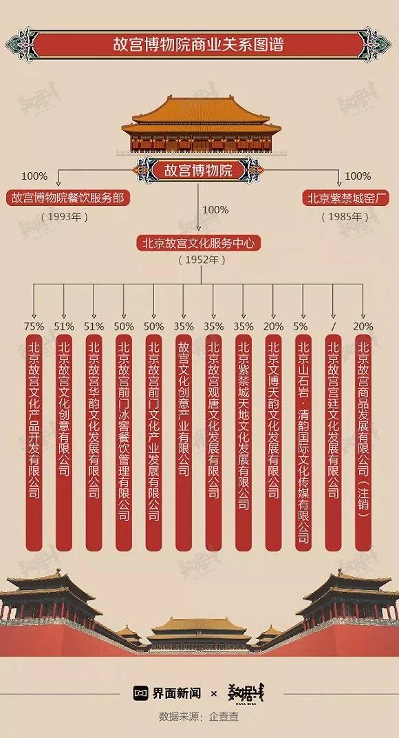 企查查数据显示,故宫博物院旗下有3家全资子公司,其中包括北京故宫文化服务中心、故宫博物院餐饮服务部和北京紫禁城窑厂。北京故宫文化服务中心旗下有12家公司,大多主营文创、餐饮等业务。