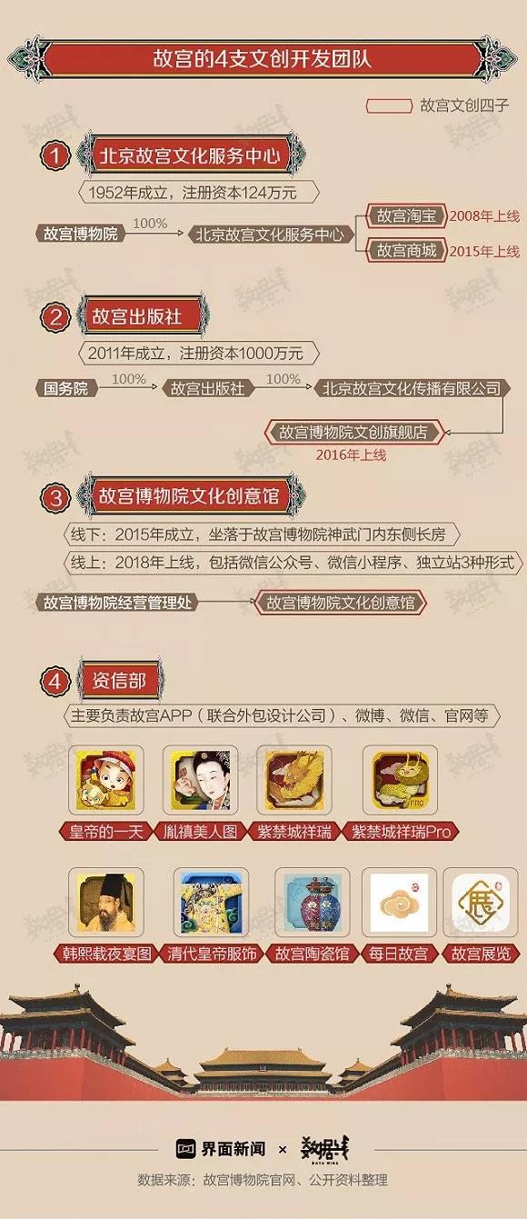 界面数据(公众号ID:shujuxian_kuaikan)梳理发现,现在故宫主要有4支团队在从事文创产品开发和销售工作: