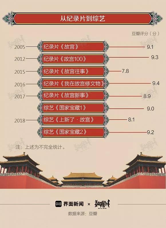 随后,故宫仿佛打开了新世界的大门,开始拍综艺节目,《国家宝藏》、《上新了·故宫》先后上线,豆瓣评分在8分以上。