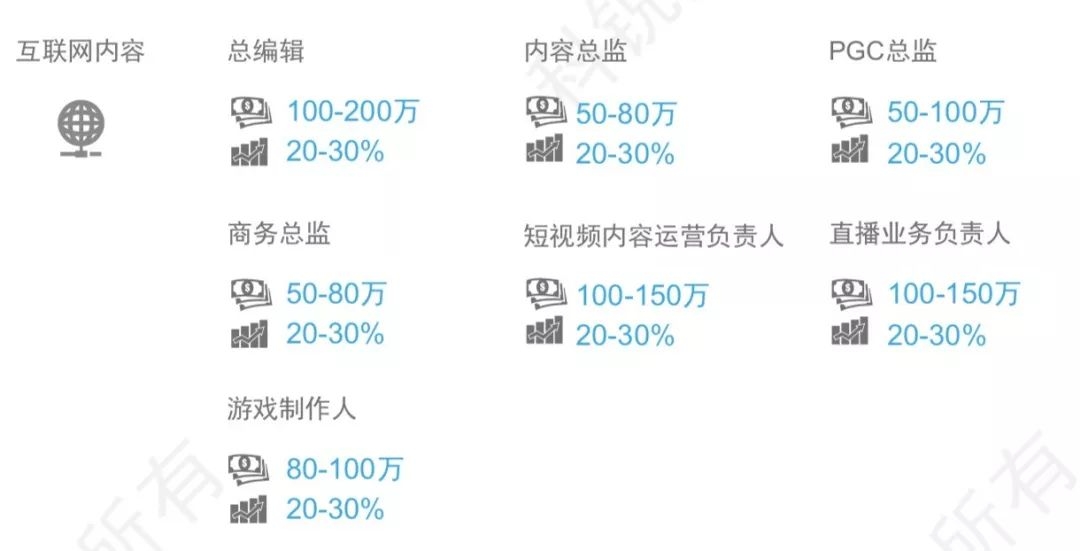 根据报告,2018-2019年泛娱乐行业整体薪酬呈上升趋势,跳槽涨幅一般在20%以上。值得注意的是,互联网短视频、手游行业薪酬整体上升趋势明显,短视频领域跳槽薪酬涨幅可达50%以上。