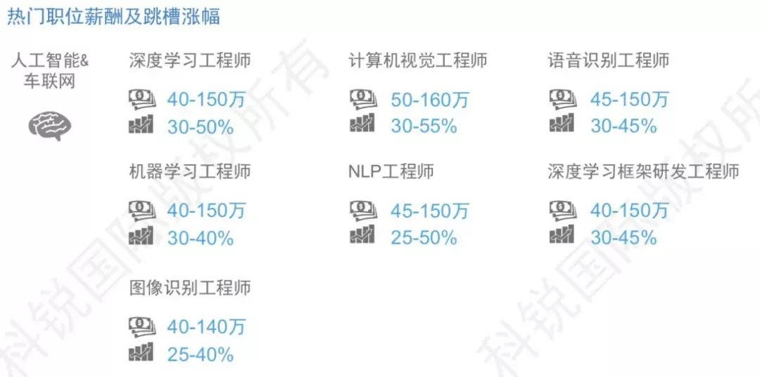 根据科锐国际专家的预测,在人工智能和车联网领域,机器学习、计算机视觉、语音识别、NLP、深度学习岗位薪资增幅均在30%以上,部分职位薪酬的跳槽涨幅可多达40-50%。