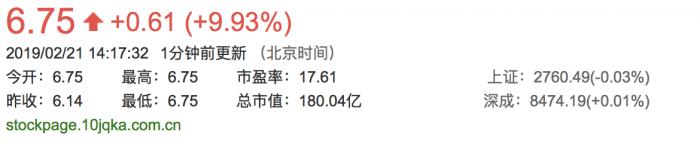 截至2月21日收盘,康恩贝股价报收6.75元,涨幅9.93%,对应总市值180亿元。