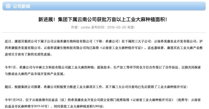 2月21日,据康恩贝集团官网晚间消息,其下属子公司云南希康生物科技有限公司在下属的三大子公司均已取得《云南省工业大麻种植许可证》。这也意味着,康恩贝在工业大麻产业推进项目方面有了新的实质性进展。