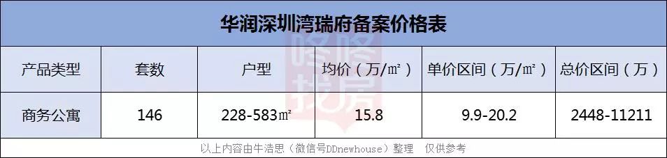 据规土委公示,本次推出的楼栋为瑞府公寓,共146套房源,户型建面约228-583㎡,均价约15.8万/㎡,单价区间在9.9-20.2万/㎡,总价区间在2448-11211万/套。
