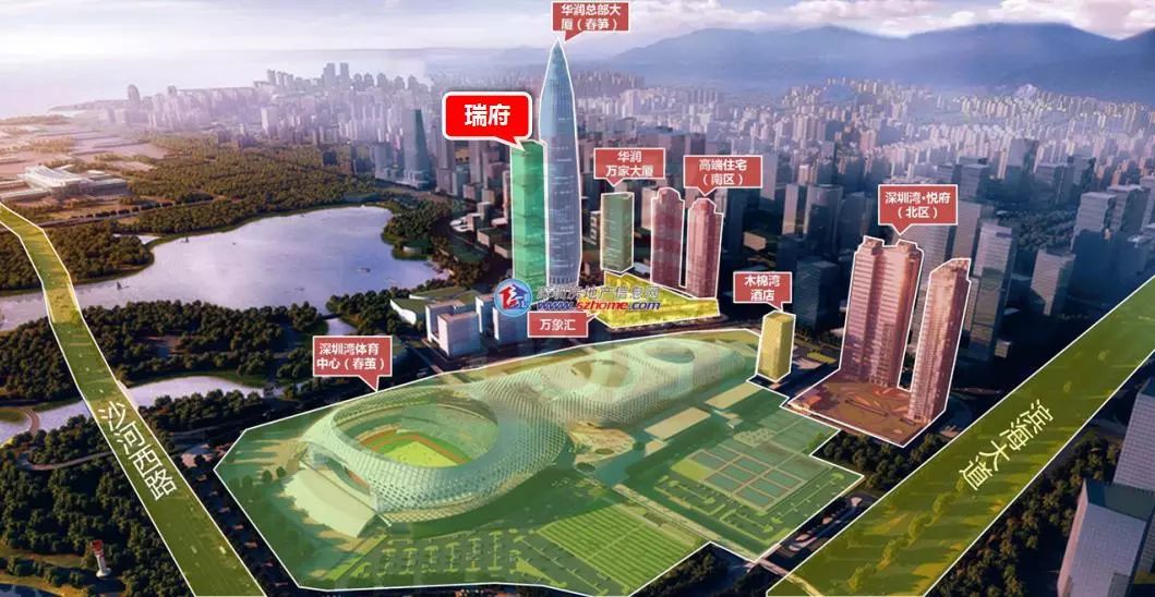华润深圳湾整个项目由南北两区组成,南区由华润总部大厦(春笋)、华润万家大厦、商业万象汇、酒店、高端商务公寓和两栋住宅组成,北区由悦府住宅和一栋酒店组成。本次推出的瑞府位于南区,紧邻华润春笋总部大厦,是一栋59层高的商务公寓。