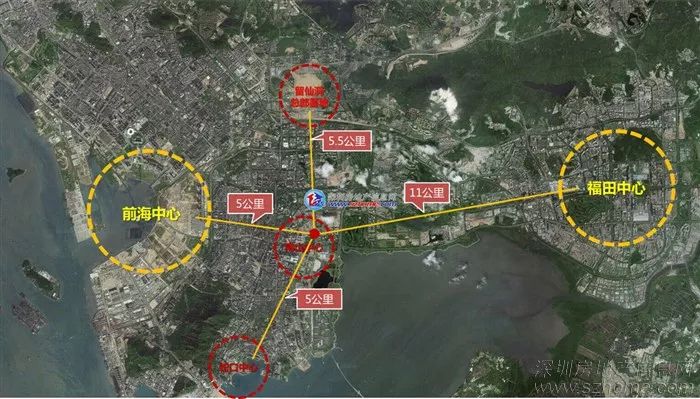 交通层面,周边汇聚了地铁2号线、11号线和在建的13号线,轨道交通便利,相信深圳人没有人不知道深圳湾体育中心春茧,直接上个图,随着城市中心的西移,10年前中心在罗湖、今天中心在福田,未来福田前海双中心的格局下,深圳湾轴线刚好就在双中心之间。