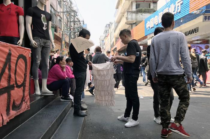 招聘者与应聘者拉着服装样品,反复沟通工艺细节和工资水平。