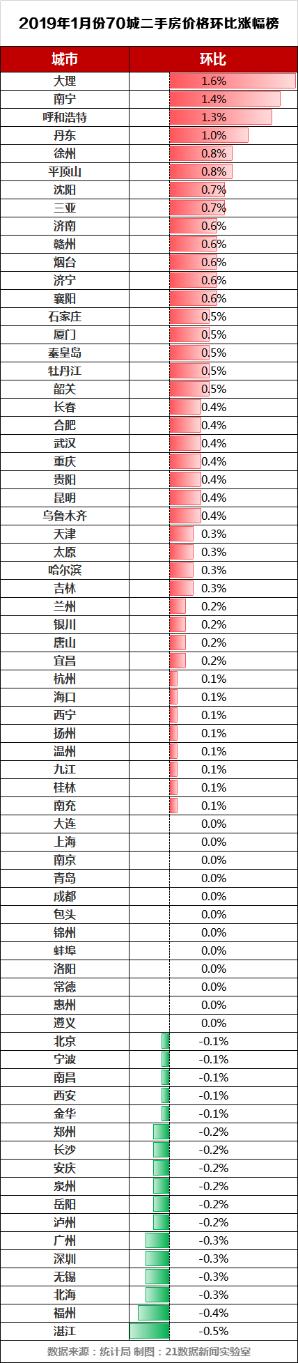 2月22日,据国家统计局数据显示,2019年1月一二线城市新建商品住宅销售价格环比微涨,二手住宅销售价格下降;三线城市环比涨幅均回落。