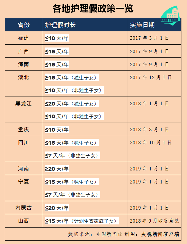 例如,从今年1月1日起施行的《河南省老年人权益保障条例》中明确,领取独生子女父母光荣证的老年人住院治疗期间,其子女所在单位应当给予每年累计不少于20日的护理假,护理假期间视为出勤。