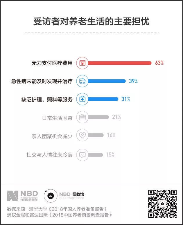 在养老重要性排序方面,有高达74%的受访者选择了“完善的医疗服务”,其次是“良好的居住和服务设施”和“良好的自然环境”;而受访者对养老生活最担忧的前三个问题均与医疗相关,分别是“无力支付医疗费用”、“急性病未能及时发现并治疗”和“缺乏护理、照料等服务”。