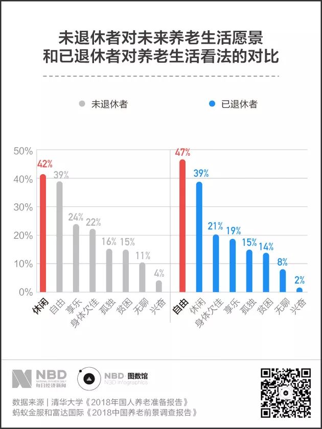 人们常说,有梦想才有未来,有梦想才有动力。那么,对于养老,未退休者又有什么样的养老愿景呢?据调查显示,未退休者排名靠前的关键词整体乐观,分别是“悠闲”、“自由”、“享乐”。但另一方面,实际退休者的养老愿景关键词则会更侧重于退休后不可避免的问题。