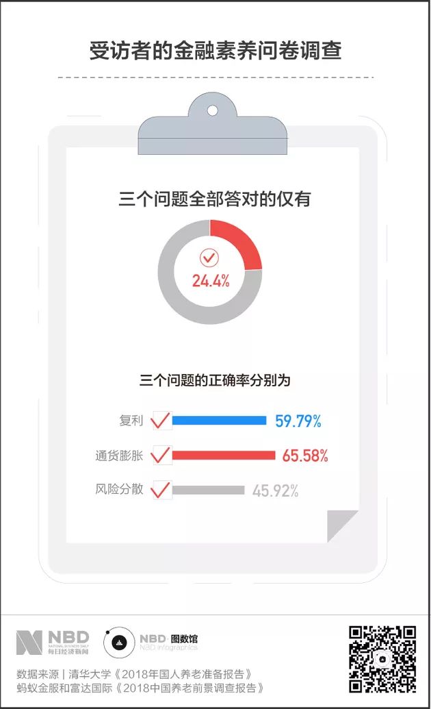 对于较大部分的受访者将现金储蓄作为仅次于政府养老的养老准备方式,其背后是金融素养的相对薄弱。在清华大学的养老准备调查报道中,利用国际广泛采用的三个衡量金融素养的标准问题(复利、通货膨胀、风险分散)进行调查后发现,三个问题全部答对的仅有24.4%,并且与国际调研数据相比较,也并没有呈现出明显优势。中国居民在通货膨胀的问题上有着较清楚认知,而复利的金融认识不如国际水平。