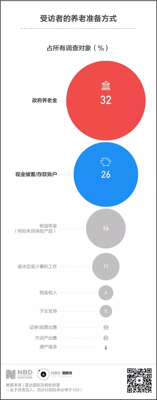 三分之二的年轻一代仍然希望依靠政府养老金和现金储蓄来养老,(28%的年轻一代仍然认为现金储蓄将成为他们退休收入的主要来源),而仅有不到三分之一的人希望依靠企业年金、保险产品、租金收入、股票或售房所得来养老。只有5%的人认为他们在晚年会得到子女的支持,这说明与老一代人相比,两代人之间养老观念发生了巨大的变化。