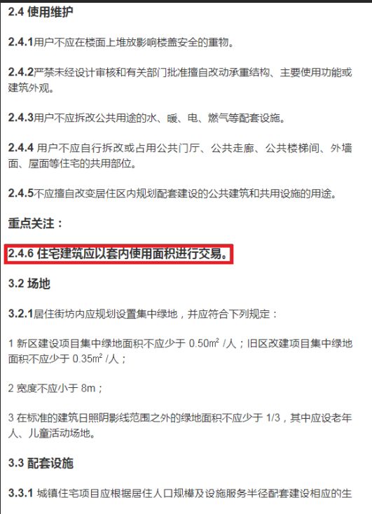 2月18日,住房和城乡建设部官方网站发布《关于<城乡给水工程项目规范>等38项住房和城乡建设领域全文强制性工程建设规范公开征求意见的通知》。在这38项强制性工程建设规范中的第10项系《住宅项目规范(征求意见稿)》,其中第二部分2.4.6条指出,“住宅建筑应以套内使用面积进行交易”。