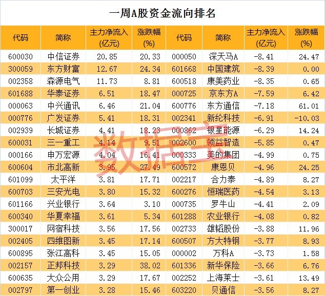 东方财富主力资金净流入12.67亿元,该股今日同样涨停,本周累计上涨24.34%,最新收盘价创两年来新高。森源电气主力资金净流入11.73亿元,股价累计涨幅8.81%。主力资金净流入规模较大的还有华泰证券、中兴通讯、广发证券等。