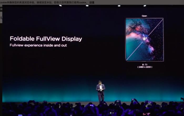 可以看到,Mate X采用了外折的折叠方式。余承东在发布会上介绍,折叠后,Mate X前屏6.6英寸,背面的屏幕6.38英寸,手机完全展开是8英寸,屏幕上也没有任何切口。