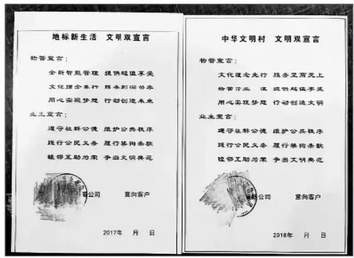 “践行公民义务,履行禁狗条款”,开发商工作人员介绍,自2017年7月1日起,客户想要在该小区购房,必须提前签署这样一份文明宣言,并且同意购房合同附件中关于不能养狗的条款。