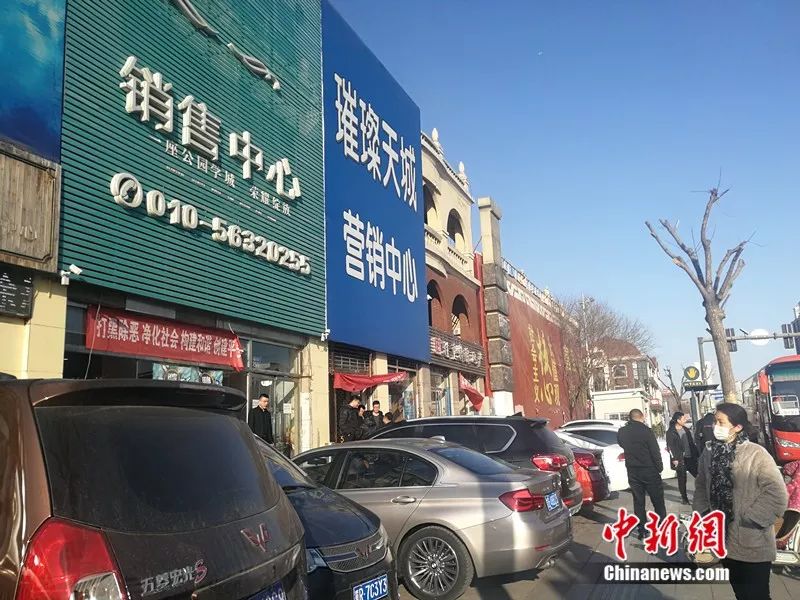 2月20日,燕郊售楼一条街上,发放楼盘广告传单的人随处可见。中新网记者 邱宇 摄