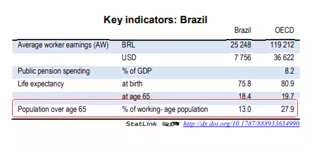 巴西65岁以上老年人口数量占劳动人口的13%(图片来源:经合组织报告)