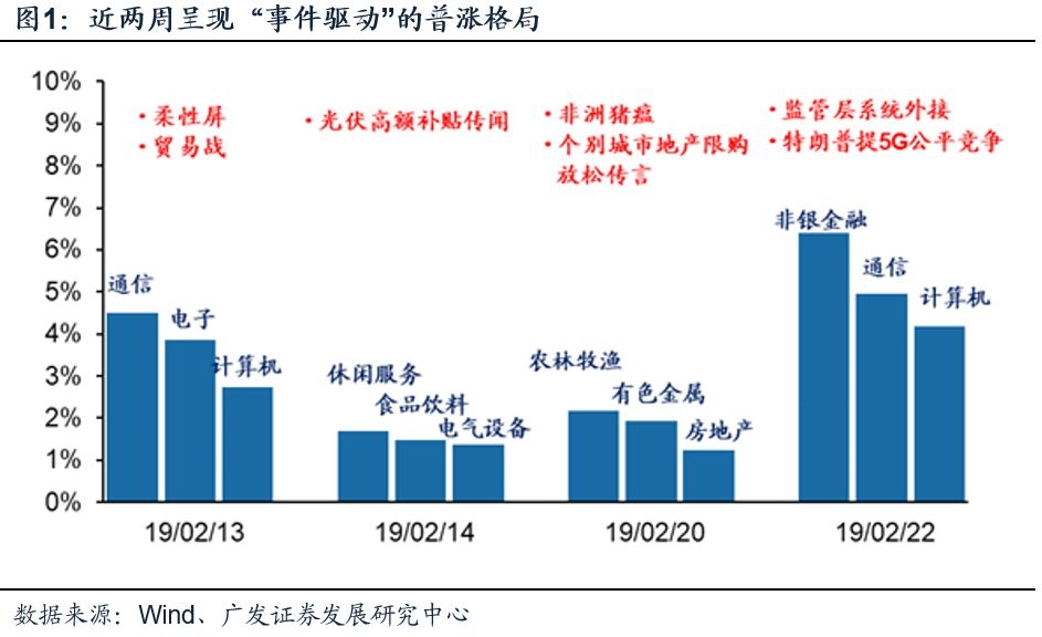 我们在1月6日报告《全球risk-on,A股春季躁动开启》中提示“2+1”因素(两个事实+一个期权)触发春季躁动开启,截止本周五上证综指反弹已超过11%。在1月20日报告《躁动延续,普涨格局》中提出外资、内资机构、个人等多类型投资者轮流“登台唱戏”带来“普涨格局”,近期市场领涨板块多由“事件驱动”,轮动和普涨依然是关键词。在2月10日《“春季躁动”颠簸前行》提出创业板暴雷后有望继续反弹,并在2月17日周报《成长股会重现18Q1的行情吗?》中继续看好创业板,近期成长股风格相对占优。春季躁动的“2+1”因素继续验证——(1)全球risk-on:美联储22日发布半年度货币政策报告,重申对未来利率政策调整保持耐心,而中美贸易谈判亦继续向偏积极的方向发展;