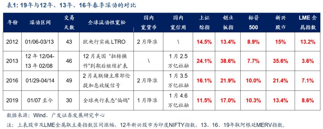 本轮春季躁动A股主要指数录得10%以上的涨幅,2010年以来共有4次春季行情A股反弹超过10%以上(2011年、2012年、2013年、2016年)。如果放在本轮全球risk-on、风险资产共振的相似背景下,19年与12、13、16年初更为相似——