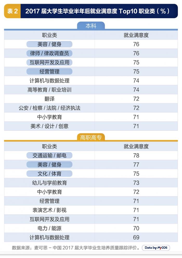 从职业角度来看,从事“美容/健身”和“律师/律政调查员”职业类的2017届本科毕业生就业满意度最高,均为76%。其次为互联网开发及应用和经营管理,满意度均为75%。