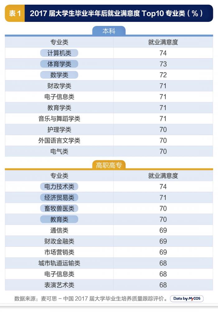 读什么专业最幸福?麦可思数据显示,对就业现状最满意的2017届本科毕业生所属专业类是计算机类(74%),其次为体育学类(73%)。对就业现状最满意的2017届高职高专毕业生所属专业类是电力技术类(74%),其次为经济贸易类(71%)。