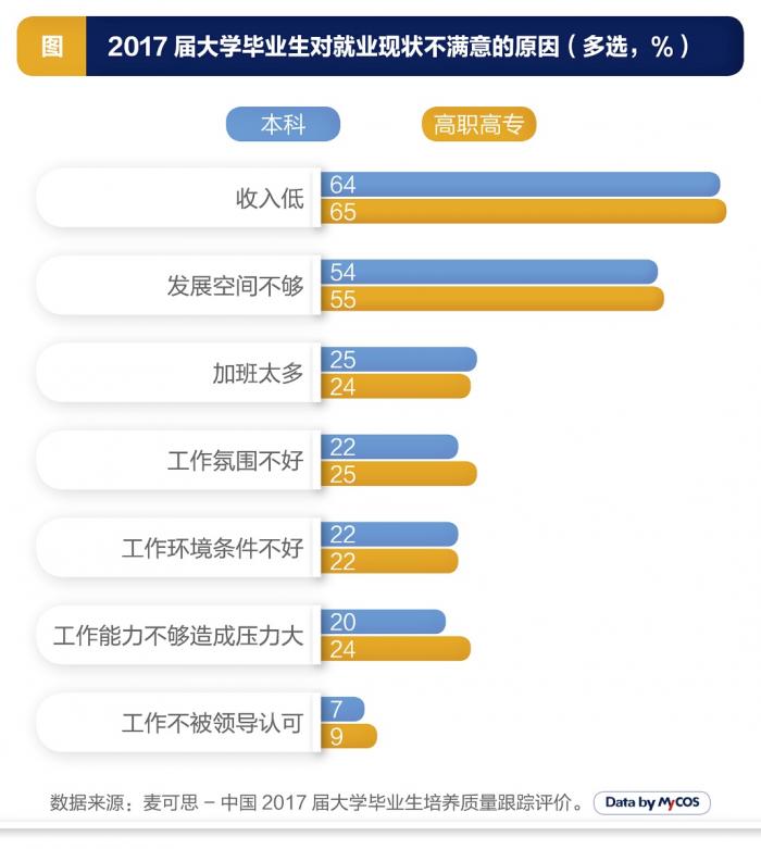 麦可思数据显示,2017届大学毕业生的就业满意度为67%。收入低、发展空间不够是2017届毕业生对就业现状不满意的主要原因。