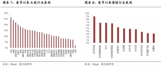 从A股和港股的行业表现上也可以看出来两地市场投资逻辑的不同。春节以来,A股的领涨行业分别是电子、通信、农林牧渔、计算机,对应的是OLED、5G、猪肉等概念(图表7),这些概念业绩尚未兑现,股价上涨主要依赖估值修复;而港股的领涨行业为传统的原材料、消费者服务、工业等业绩相对较为明确的行业,电讯业和资讯科技业这两个A股热点板块在港股的上涨反而不多(图表8)。