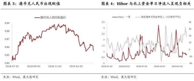 (3)人民币兑港币汇率上升。从去年11月份至今,港币兑人民币一直处于贬值的趋势,目前已经从11月份的高点下跌了330BP(图表3)。这使得南下资金需要承受港币汇率贬值带来的损失。