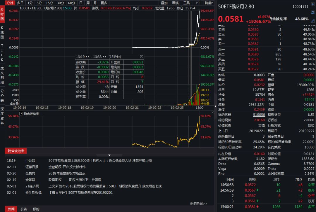 “但今日股市涨幅较大,50ETF基金涨7.56%,收2.816。2月行权价2.8的看涨期权合约从深度虚值期权变成了一个浅实值期权,其价格也要有较大的涨幅。我们根据期权定价公式,按标的价格2.816,标的历史波动率16.43%,剩余到期日2天,无风险利率3.06%,计算该期权合约的理论价格。该合约理论价格为0.0263元,期权的隐含波动率为48.68%。这表明今日期权价格涨幅过大的原因主要有两点: