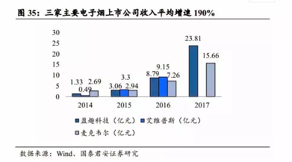 国泰君安研报显示,麦克韦尔、盈趣科技、艾维普思的电子烟业务在2014年到2017年间营业收入均大幅增长。麦克韦尔从2.69亿元上升到15.66亿元,3年增长6倍,复合增长率155%;盈趣科技从1.33亿元上升到23.8亿元,增长将近18倍,复合增长率206%;艾维普思从0.49亿元上升到9亿元,复合增长率207%。此外,盈趣科技毛利率在50%以上,麦克韦尔、艾维普思等毛利率均在30%以上,且有逐步提升的趋势。