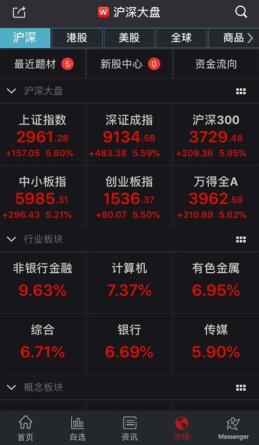 截至25日收盘,沪指报2961.28点,涨幅5.60%,深成指报9134.58点,涨幅5.59%,创业板指报1536.37点,涨幅5.50%。