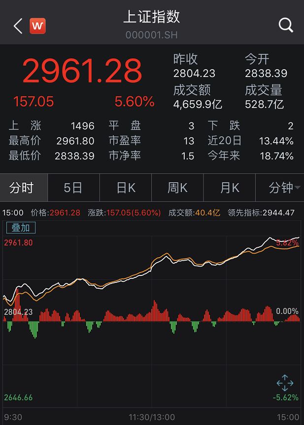 上证综指收涨5.6%报2961.28点,日内连续攻下2800、2900两道整数关口,创2015年7月以来最大日涨幅: