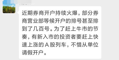 有人表示:近期券商开户持续火爆,部分券商营业部等候开户的排号甚至排到了几百号。为了赶上牛市的节奏,有新入市的投资者要赶上快速上涨的A股列车,不惜从单位请假开户。