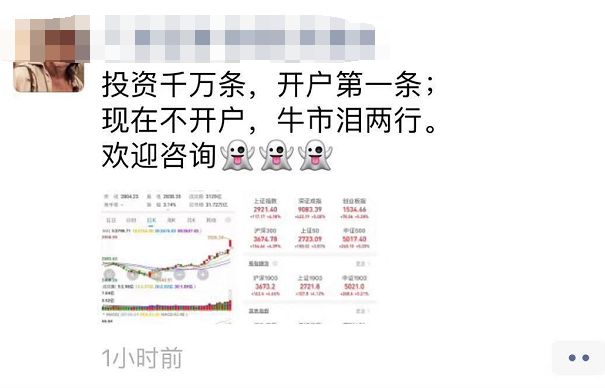 其中,“投资千万条,开户第一条!不要去追涨,小心泪两行!”“熊市不开户,牛市难致富!底部不布局,反弹两行泪”等金句刷屏。