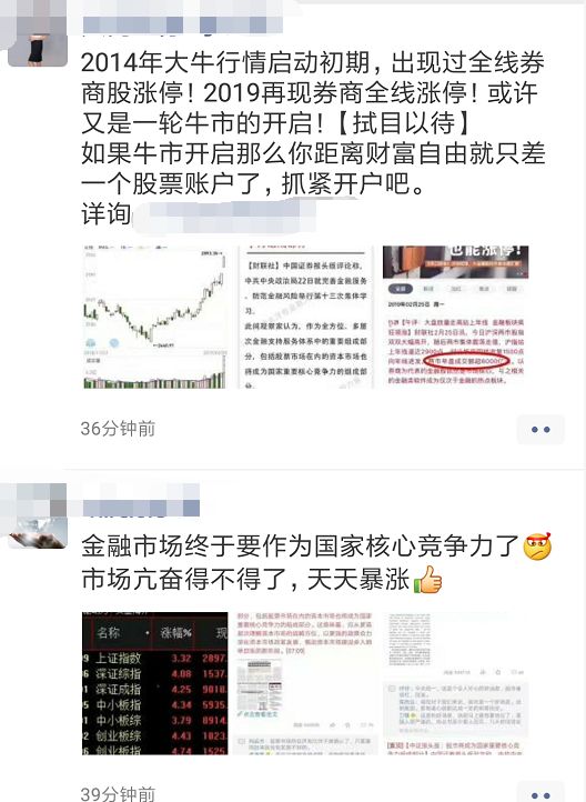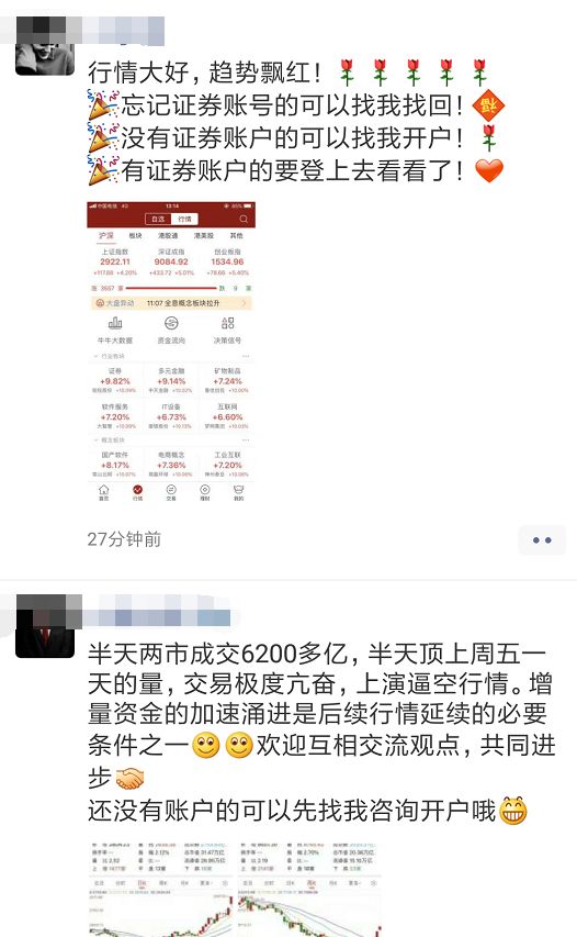 行情助推下,券商一线人员也在朋友圈疯狂做广告: