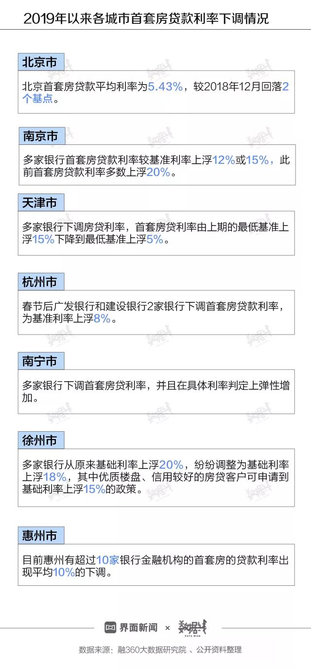 据不完全统计,2019年以来(截至2月26日),至少有北京、杭州、南京等7个城市下调首套房贷利率。