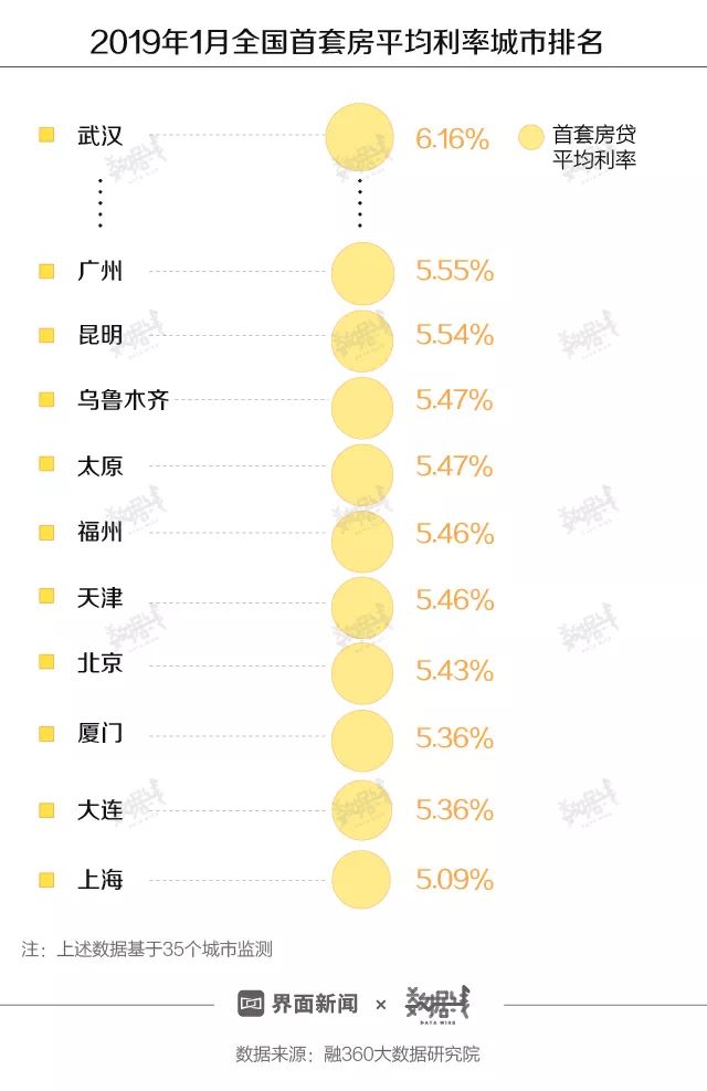 据融360大数据研究院,2019年1月,在35城首套房贷款平均利率排行中,武汉最高,首套房贷款平均利率为6.16%。相比之下,上海和北京均处于较低水平,并分别以5.09%和5.43%的首套房贷款平均利率,居于排行榜后十位。