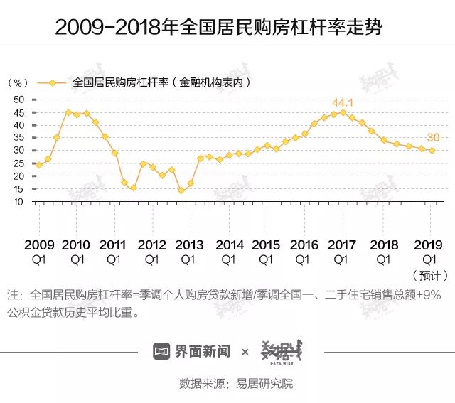 购房杠杆率也在持续下跌。据易居研究院,2017年,全国居民购房杠杆率达到峰值44.1%后,开始持续走低,截至2018年第四季度,全国居民购房杠杆率跌至31%(相当于2011年水平),已连续7个季度走低。