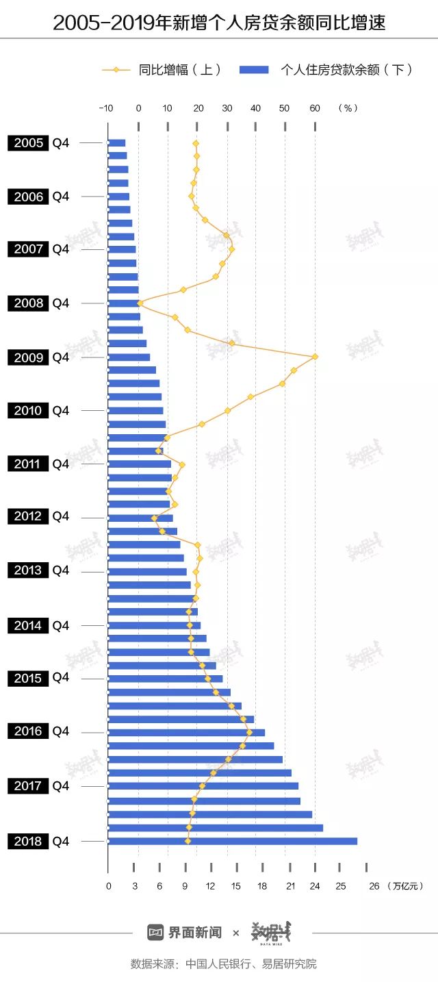 易居研究院数据显示,2005年至2018年,个人住房贷款余额稳步增长。2018年第四季度,个人住房贷款余额达25.75万亿元。 从同比增幅来看,2016年第四季度,个人住房贷款余额同比增长在达到小高峰36.8%后,开始持续走低。2018年第四季度,跌至17.8%。