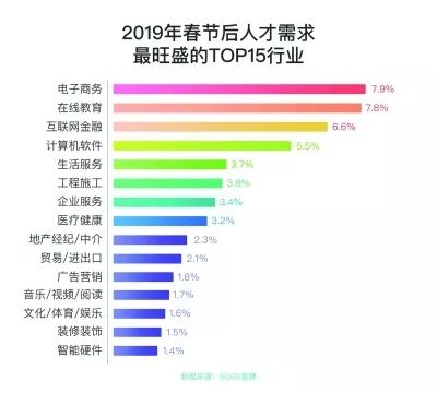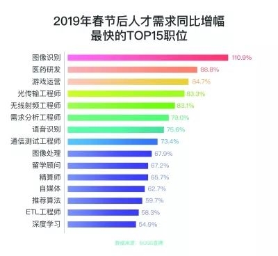 具体来看,2019年春节后首周人才需求最旺盛的前三个细分领域:电子商务、在线教育和互联网金融均为互联网行业。同时,BOSS直聘研究院数据显示,2019春节后首周人才需求同比增幅最快的15个岗位中,AI相关岗位占据超过三分之一。