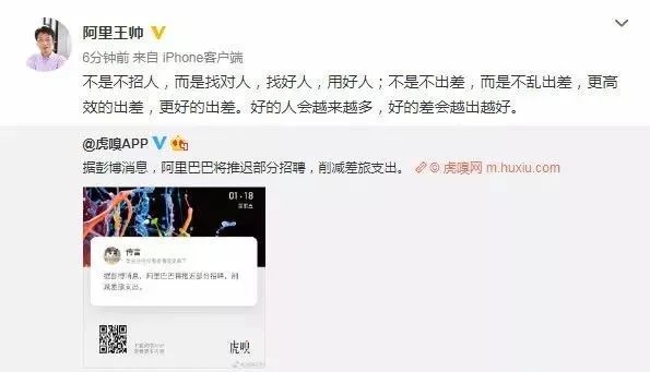 当时,阿里巴巴集团市场公关委员会主席王帅火速在微博回应称,不是不招人,而是找对人,也不是不是不出差,而是不乱出差。不过此条微博目前已不可见。